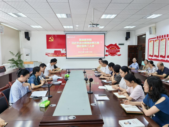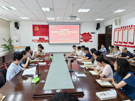2025年10月10日,基础医学院于1-411会议室开展理论宣传二人讲活动,本次宣讲主题是《习近平谈治国理政》第五卷重要理论、遵义医科大学第二次党员代表大会精神。基础医学院各支部书记,各教研室负责人参加。