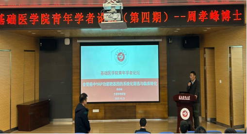 2025年10月23日,基础医学院成功举办了第四期青年学者论坛。本次论坛由生理学教研室青年博士周孝峰主讲,主题为“食管癌中YAP功能靶基因的系统化筛选与临床转化”。基础医学院副院长韩勇、生命科学研究院副院长保玉心出席了此次论坛,生理学教研室主任孔德营副教授担任主持,学院全体博士参加了本次讲座。