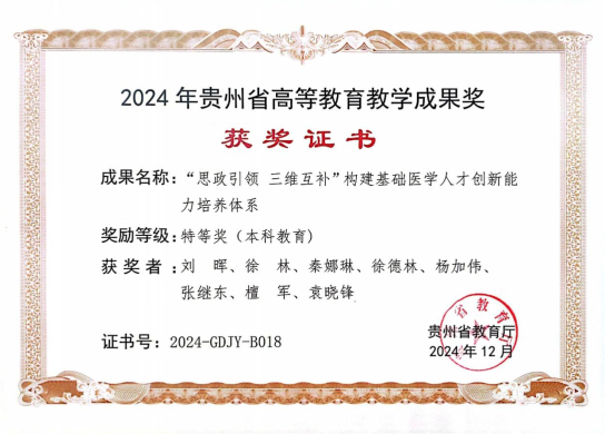 贵州省教育厅公布了2024年高等教育省级教学成果奖获奖名单,我院《“思政引领 三维互补”构建基础医学人才创新能力培养体系》项目,荣获省级教学成果最高荣誉——特等奖。