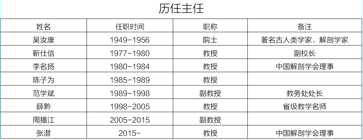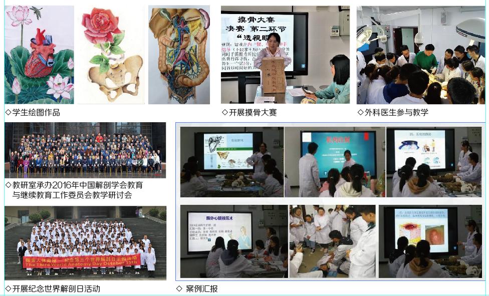 人体解剖学教研室前身为大连医学院解剖学教研室,1969年南迁到遵义,至今已走过50多年的光辉历程。上世纪50年代起,著名古人类学家、解剖学家吴汝康学部委员、解剖学家靳仕信教授、李名扬教授等曾先后担任教研室主任,是学校历史悠久、最具影响力的教研室之一。教研室全体老师秉承遵医精神,在教学与科研上均取得较好的成绩,尤其在人类骨骼肌的形态学研究取得丰硕的成果,在国内有一定知名度。参与编写了全国统编教材《人体解剖学》(第一版),其中参编的《人体解剖彩色挂图》获国家教委优秀教材特等奖,《人体解剖彩色图谱》获国家新闻总署优秀图书一等奖。近年来,先后获得省科技进步二等奖2项,三等奖3项,省卫生厅成果一等奖2项。